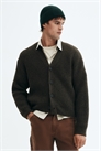 Кардиган из трикотажа в рубчик с глубоким V-образным вырезом, застежкой на пуговицы и длинными рукавами. Свободный крой для пышного, но не слишком большого силуэта.