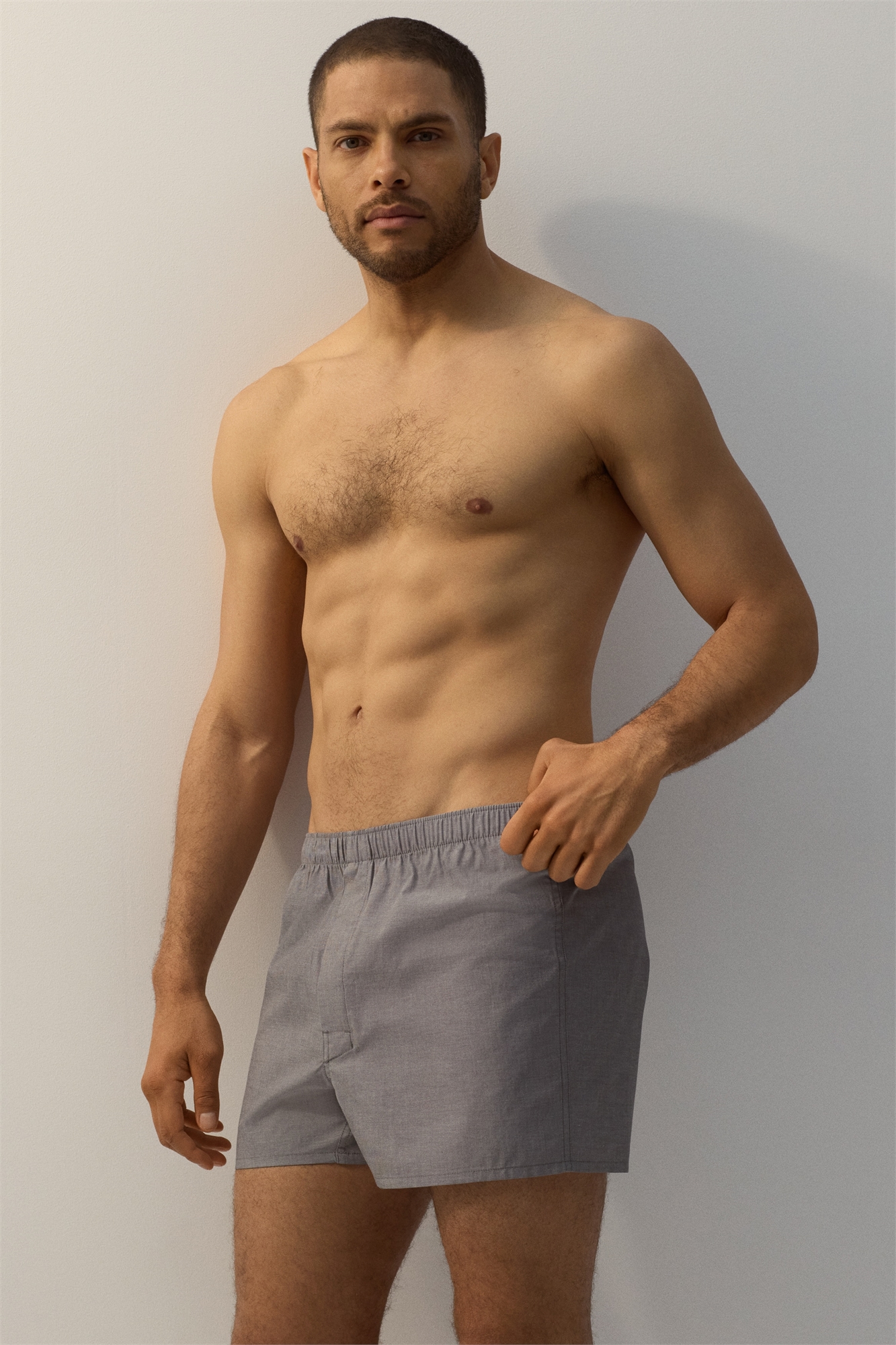 Трусы-боксеры из мягкого тканого материала с эластичной талией, длинными ногами и ширинкой на пуговицах.