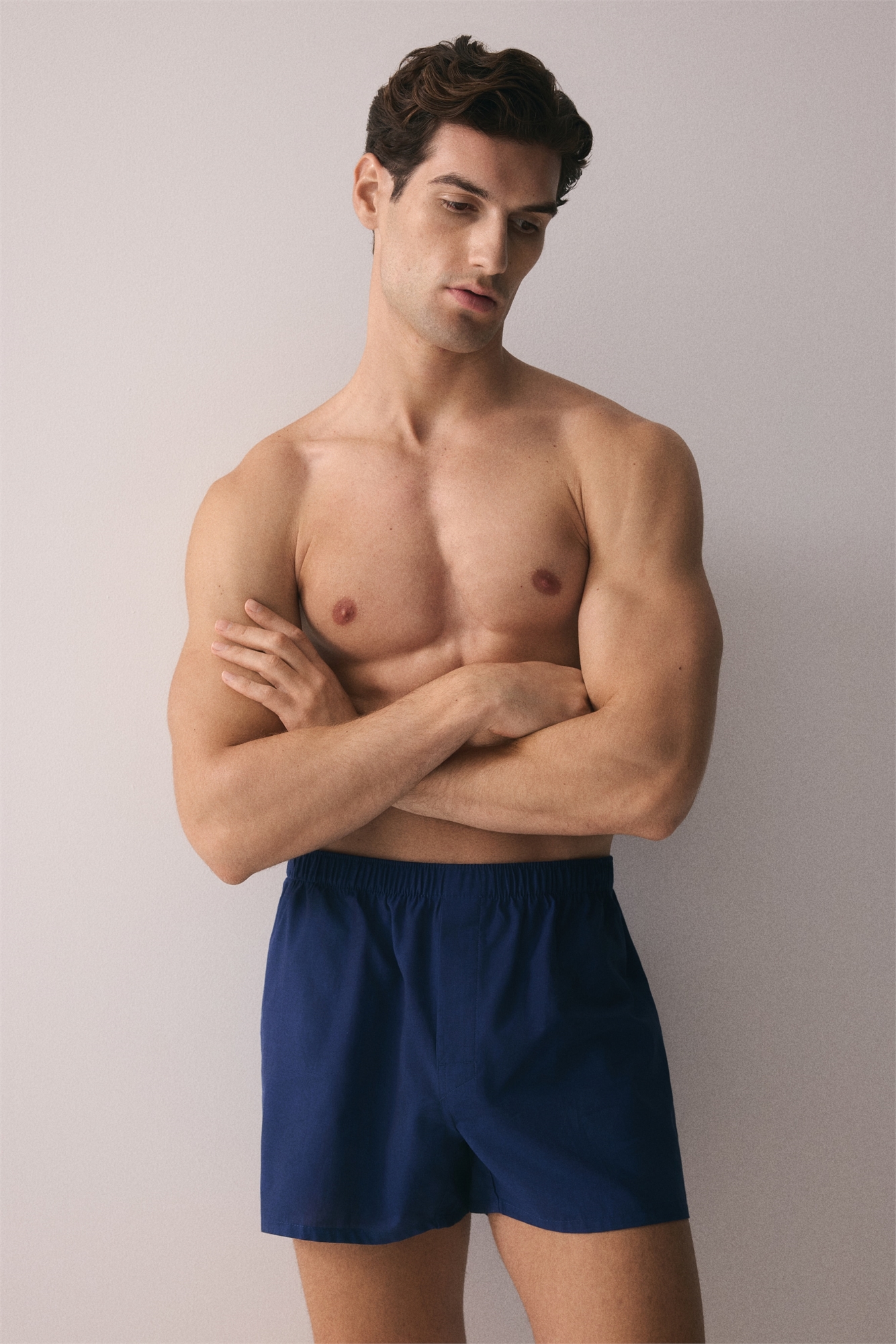 Трусы-боксеры из мягкого тканого материала с эластичной талией, длинными ногами и ширинкой на пуговицах.