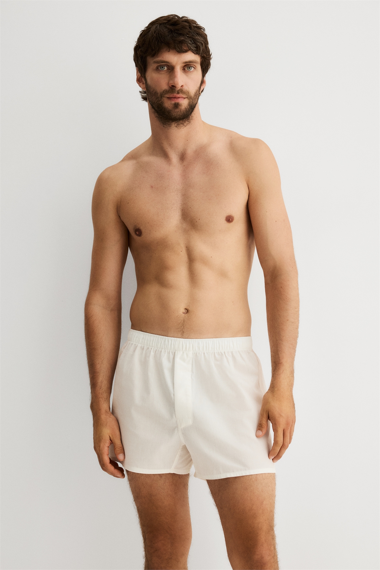 Трусы-боксеры из мягкого тканого материала с эластичной талией, длинными ногами и ширинкой на пуговицах.