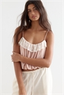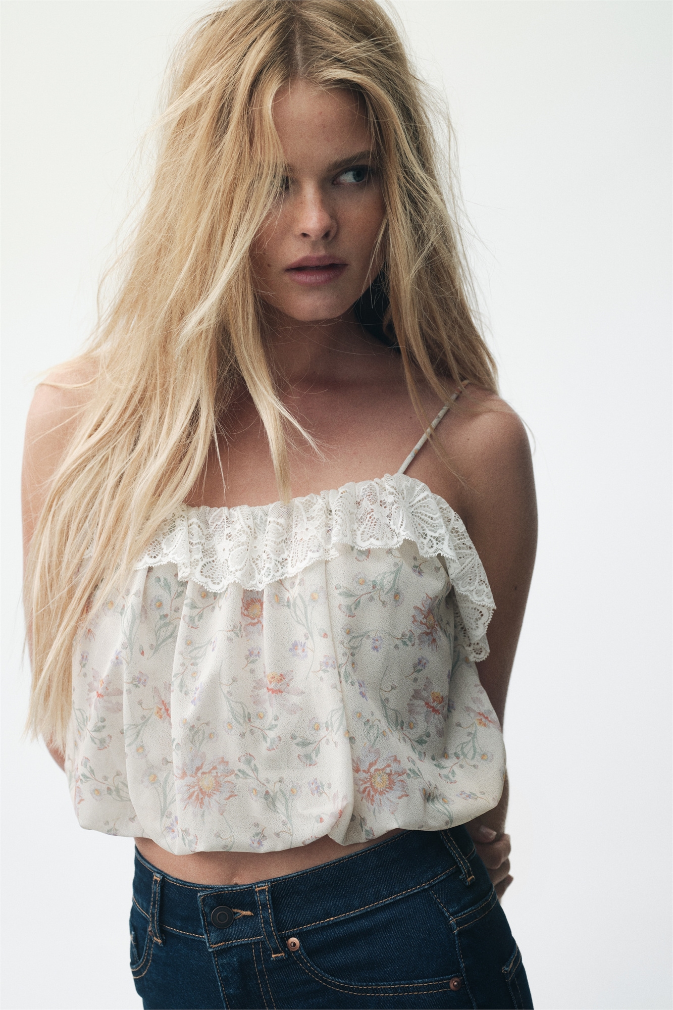 Облегающий топ из джерси со складками по верху и кружевной отделкой спереди. Бретельки и подол в форме пузыря.