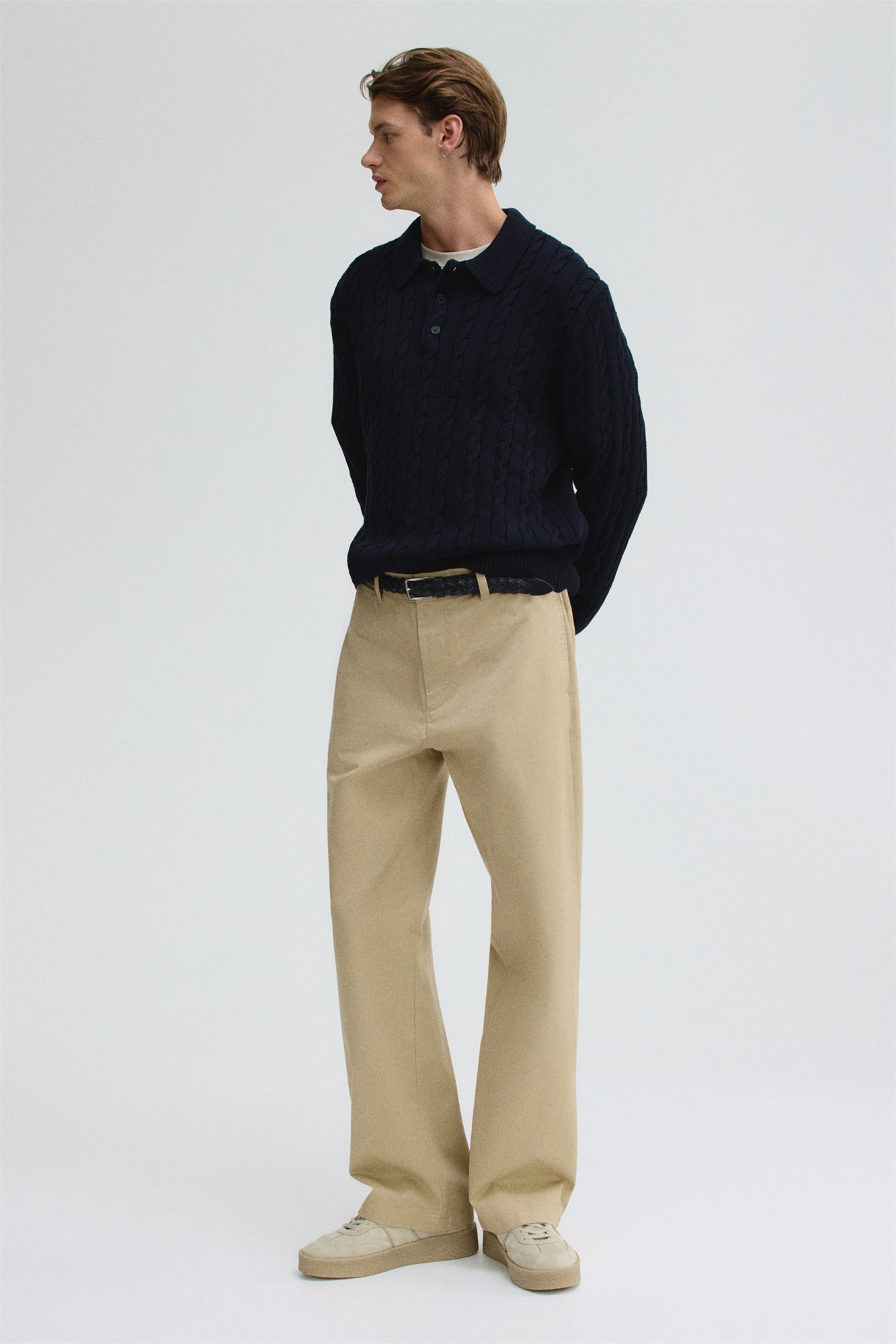 Джемпер-поло из мягкого хлопкового трикотажа в рубчик с воротником, застежкой на пуговицы и широкой ребристой отделкой на манжетах и подоле. Регулярный крой обеспечивает удобство ношения и классический силуэт.