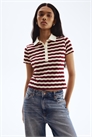 Короткая приталенная рубашка-поло из фактурного трикотажа с ребристым воротником и застежкой на пуговицы. Короткие рукава и прямой подол.