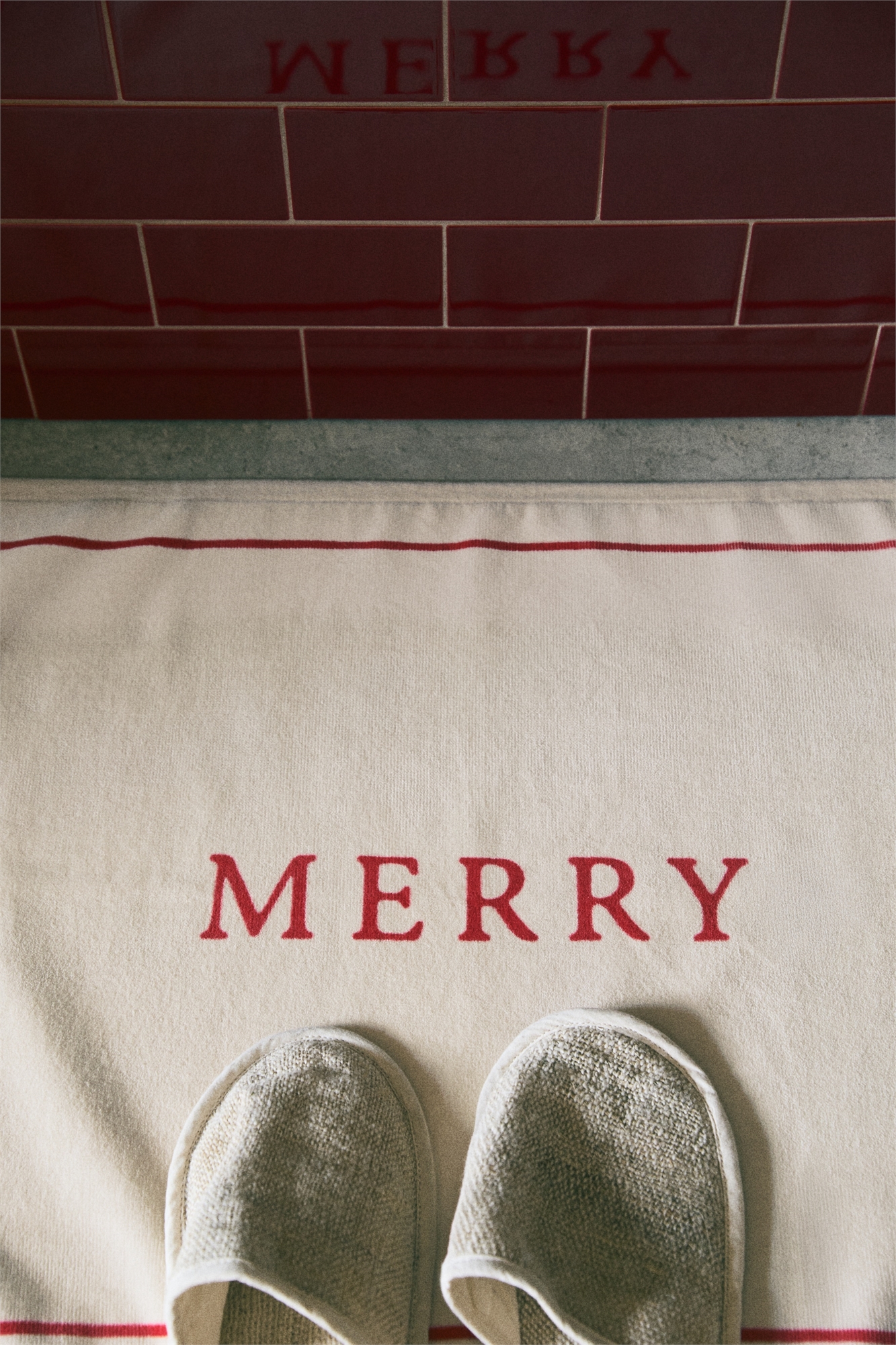 Прямоугольный коврик для ванной из мягкого велюра с праздничным принтом по центру. С обратной стороны имеет противоскользящие накладки. 750 GSM.