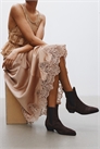Ботинки по щиколотку из мягкой кожи с оттопыренными носками, эластичными прорезями по бокам и петлей спереди и сзади. Блочный каблук, стелька и подкладка из джерси.