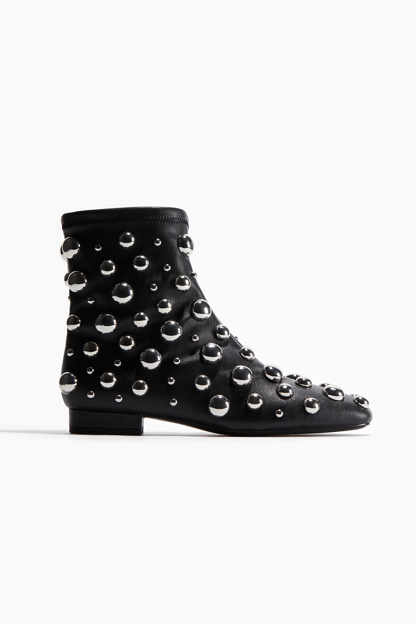Ботинки по щиколотку из лакированной ткани с металлическими шипами и закругленными носками. Подкладка и стелька из джерси.