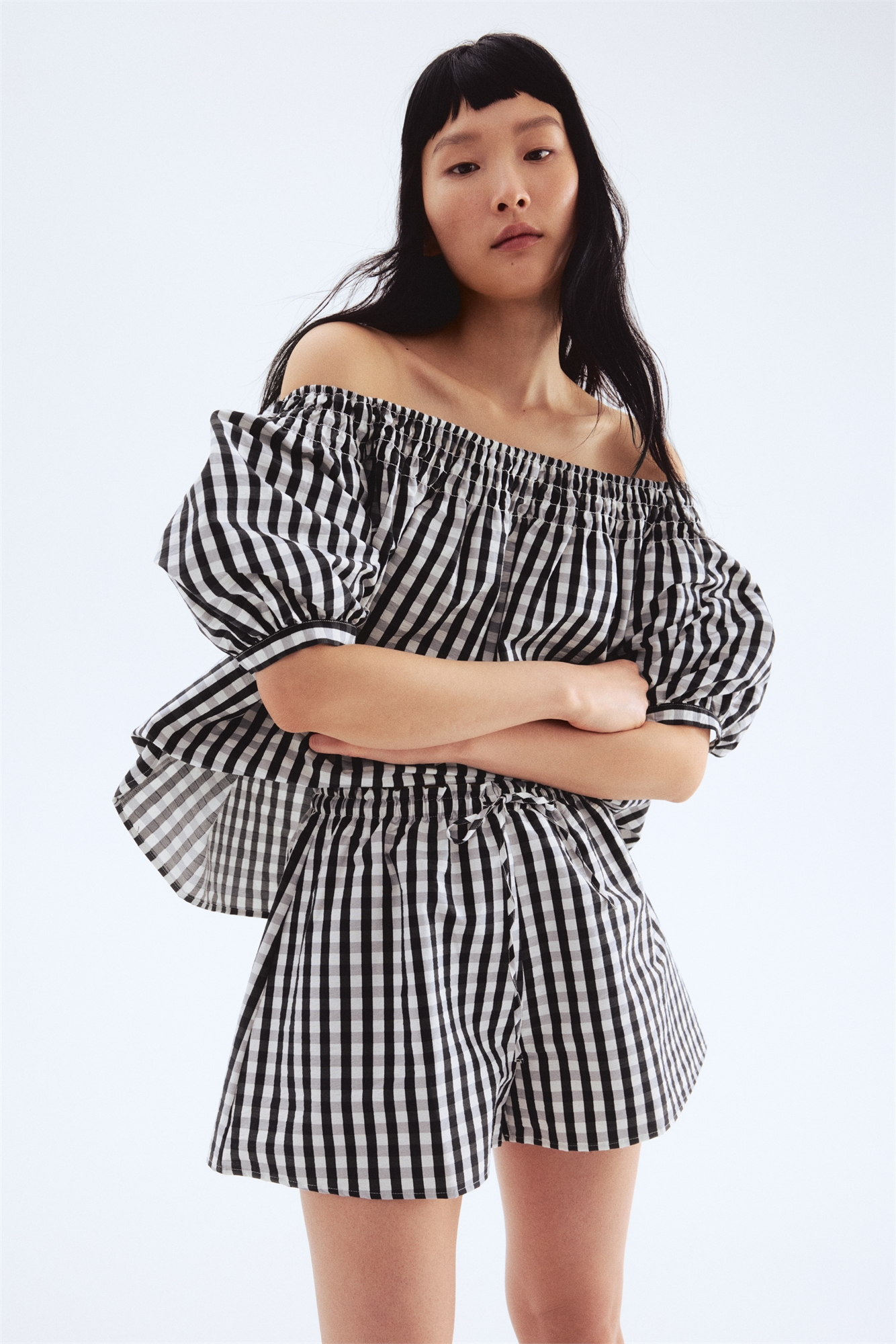 Блузка с завышенной талией на плечах из тканого материала с эластичной вставкой в верхней части. Рукава-баллоны длиной 3/4 с узкими манжетами на пуговицах.