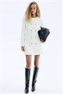 Короткое приталенное платье-блейзер из тканого материала с круглым вырезом и двубортной застежкой спереди. Накладки на плечах и втачные передние карманы с клапаном. На подкладке.