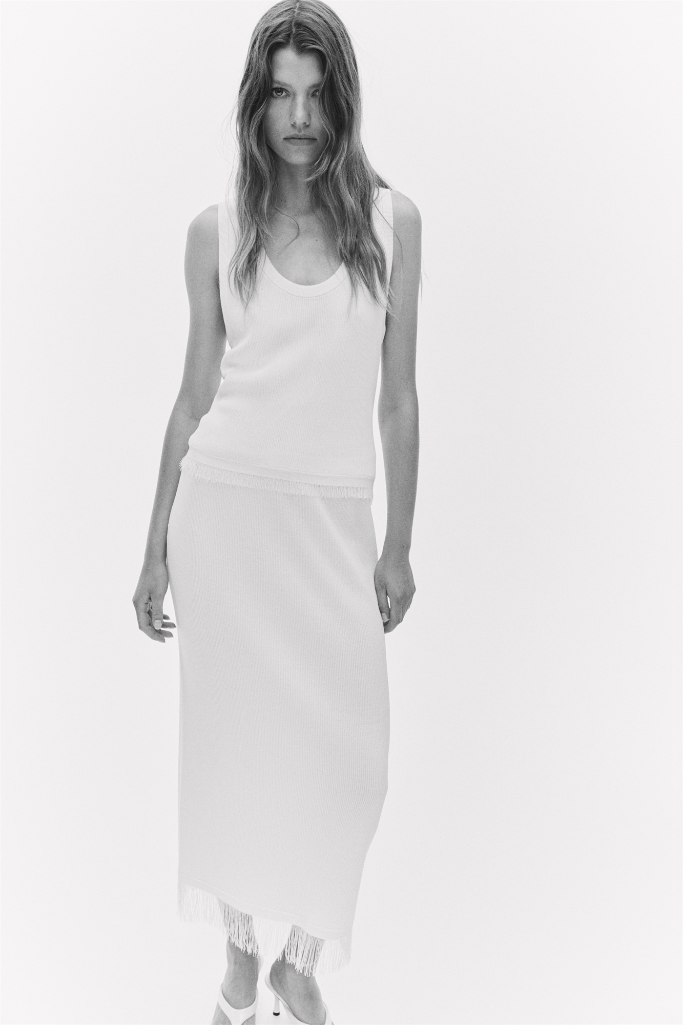 Приталенная юбка длиной до колен из трикотажа в рубчик с высокой талией и эластичной отделкой, подол отделан бахромой.