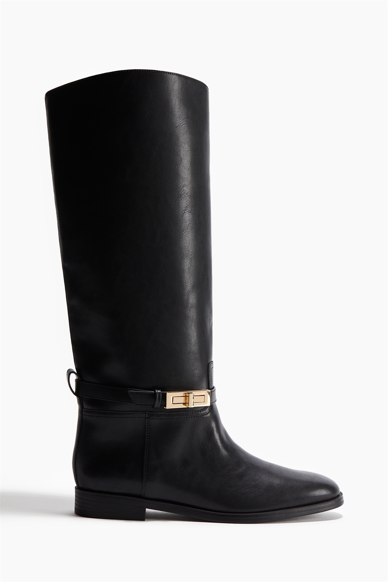 Ботинки до колена с декоративным ремешком с металлической пряжкой вокруг лодыжки. Закругленные мыски и низкий каблук. Подкладка и стелька из джерси.