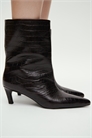 Ботинки на каблуке из мягкой кожи с заостренным носком и видимым швом спереди. Атласные подкладка и стелька.