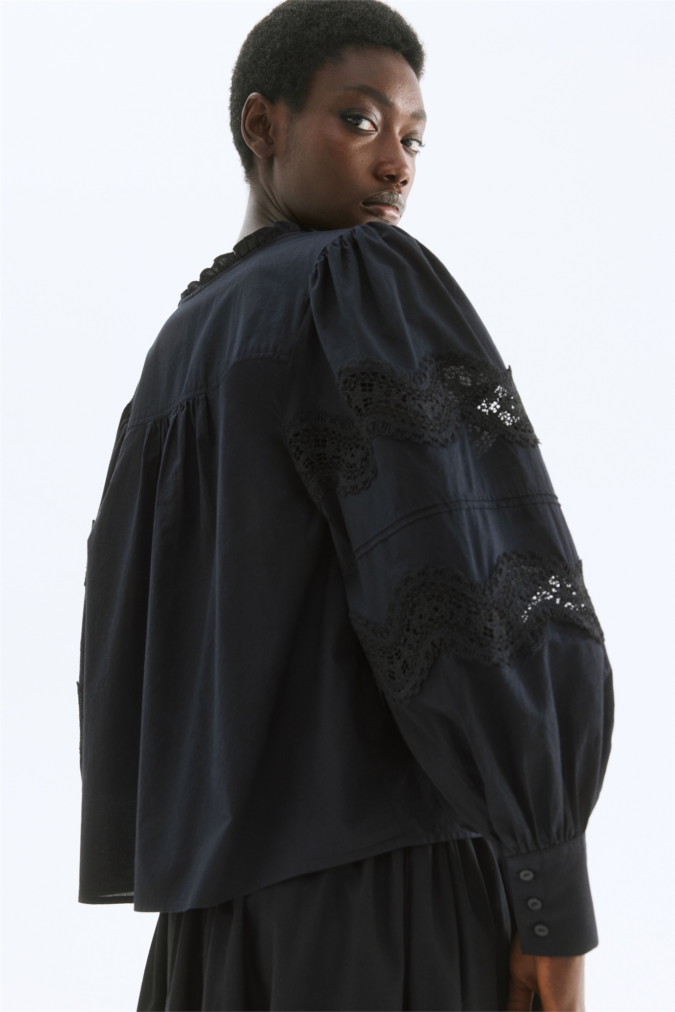 Блузка из воздушного хлопкового полотна с отложным воротником и пуговицами спереди. Длинные рукава-баллон с кружевными вставками и широкими манжетами на пуговицах.