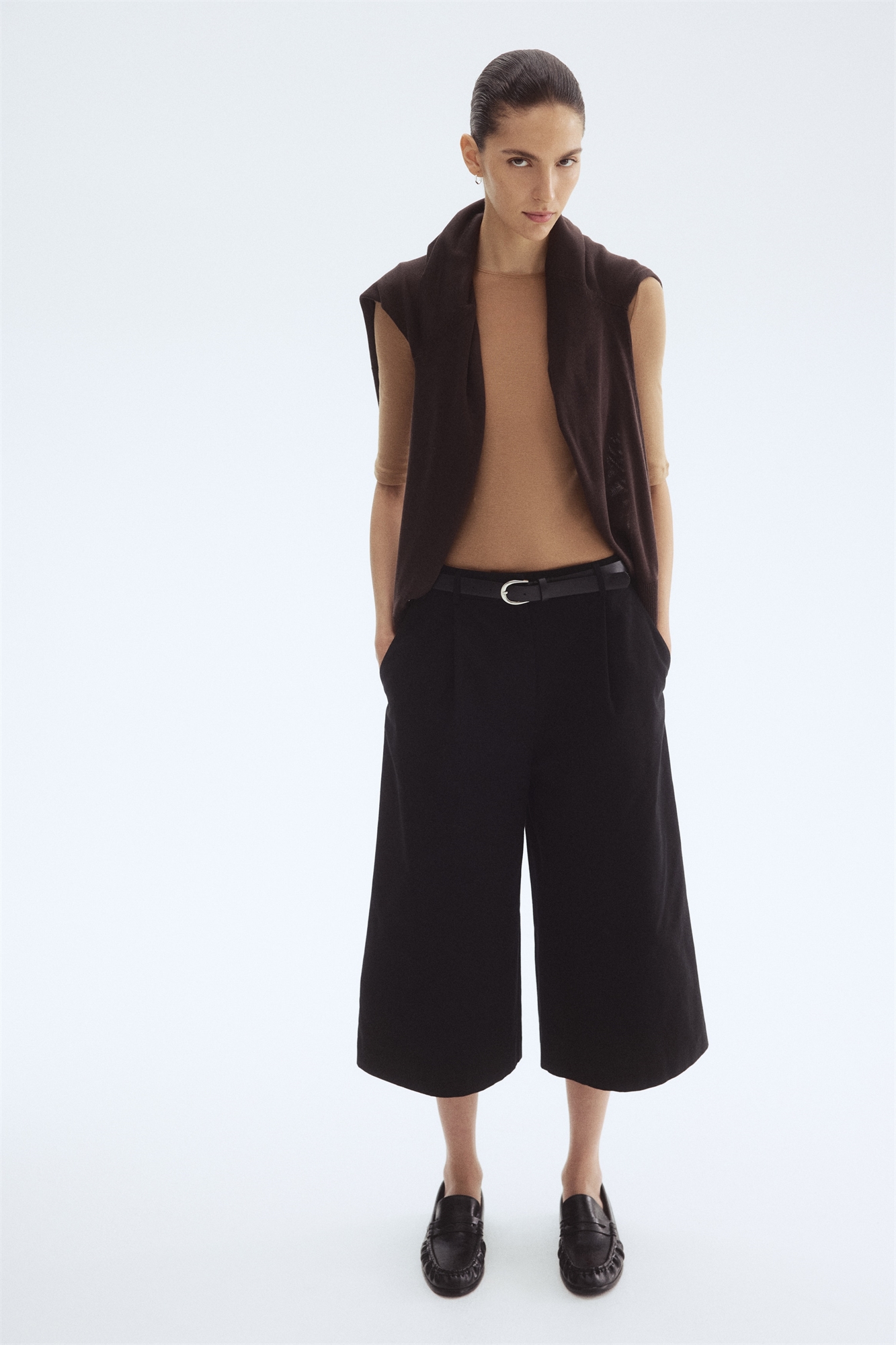 Хлопковые брюки с высоким поясом, ремнем и ширинкой на молнии с застежкой на пуговицу и крючок. Косые боковые карманы, складки и ноги длиной 3/4.