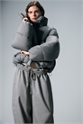Пуховая куртка с мягкой подкладкой оверсайз-силуэта и короткой длины. Она имеет высокий воротник-стойку, двустороннюю застежку-молнию спереди, скрытую мягкой планкой с застежками-липучками, и карманы в боковых швах, смещенные немного вперед. Подол сзади немного удлинен, а на подоле имеются завязки для регулировки формы. В завершение - тонкая строчка и внутренний карман для функциональности.