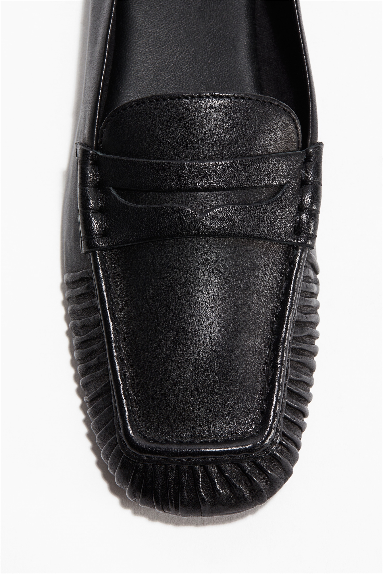 Лоферы из мягкой кожи с застежкой на копейку и швом мокасины со сборками спереди. Подкладка из джерси и кожаная стелька.