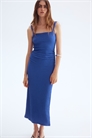 Приталенное платье длиной до колен из фактурного джерси с прямым вырезом и перекрученными бретелями. Складки на талии по бокам для легкой драпировки и прямой подол с разрезом с одной стороны. Подкладка в верхней части.