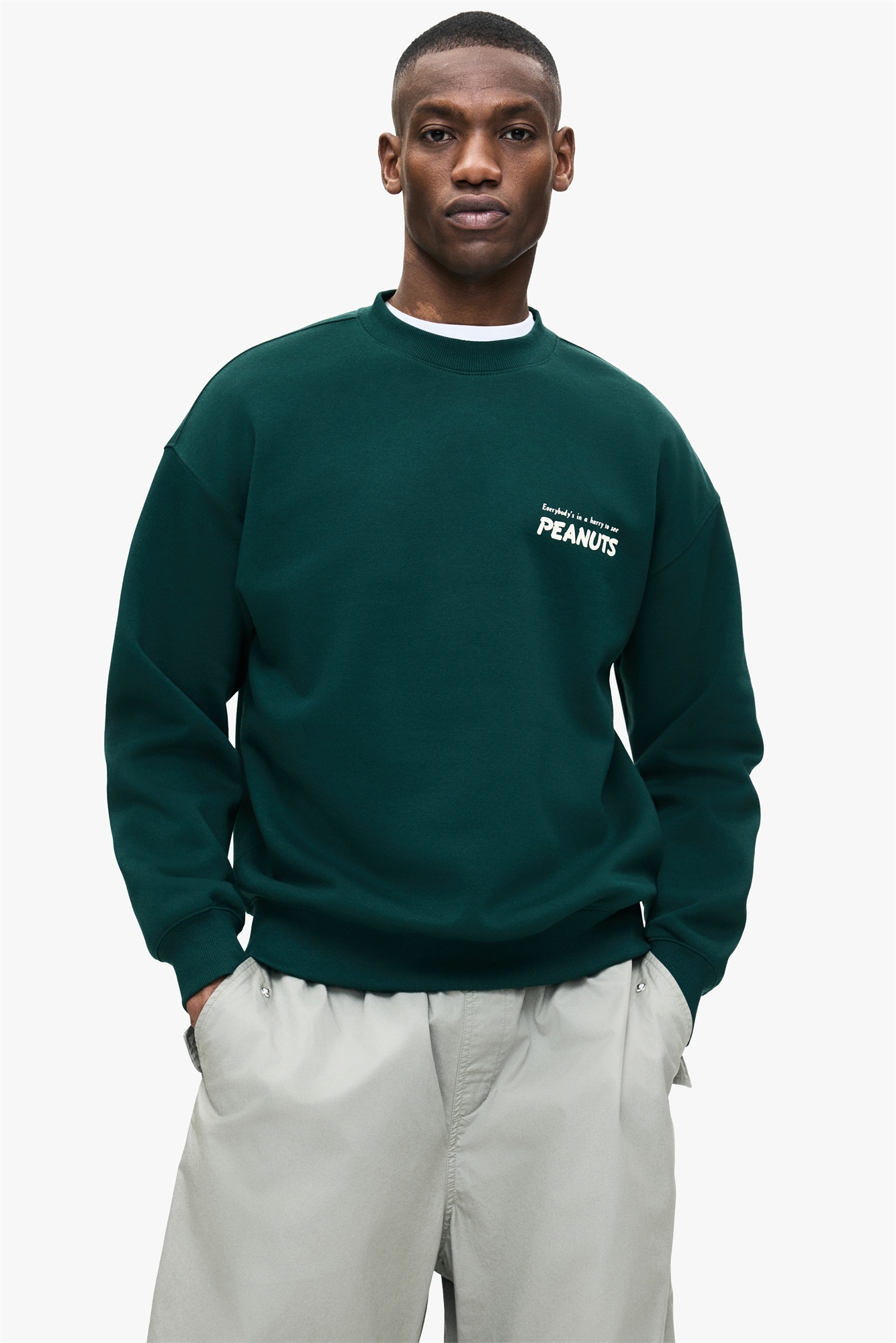 Топ из толстовки средней плотности из смеси хлопка с мягкой матовой изнанкой и принтом. Круглый вырез с ребристой отделкой, манжеты и подол в рубчик. Посадка оверсайз для придания мешковатого, свободного силуэта.