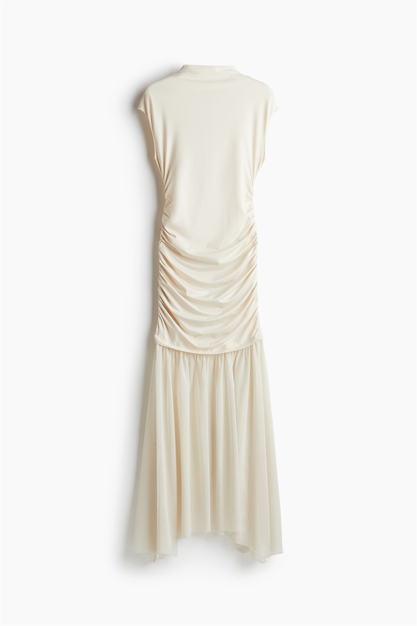 Приталенное платье длиной до колен из мягкого трикотажа с черепаховой горловиной, рукавами-кап и собранными боковыми швами для эффекта драпировки. Юбка из сетки с асимметричным подолом. Без подкладки.