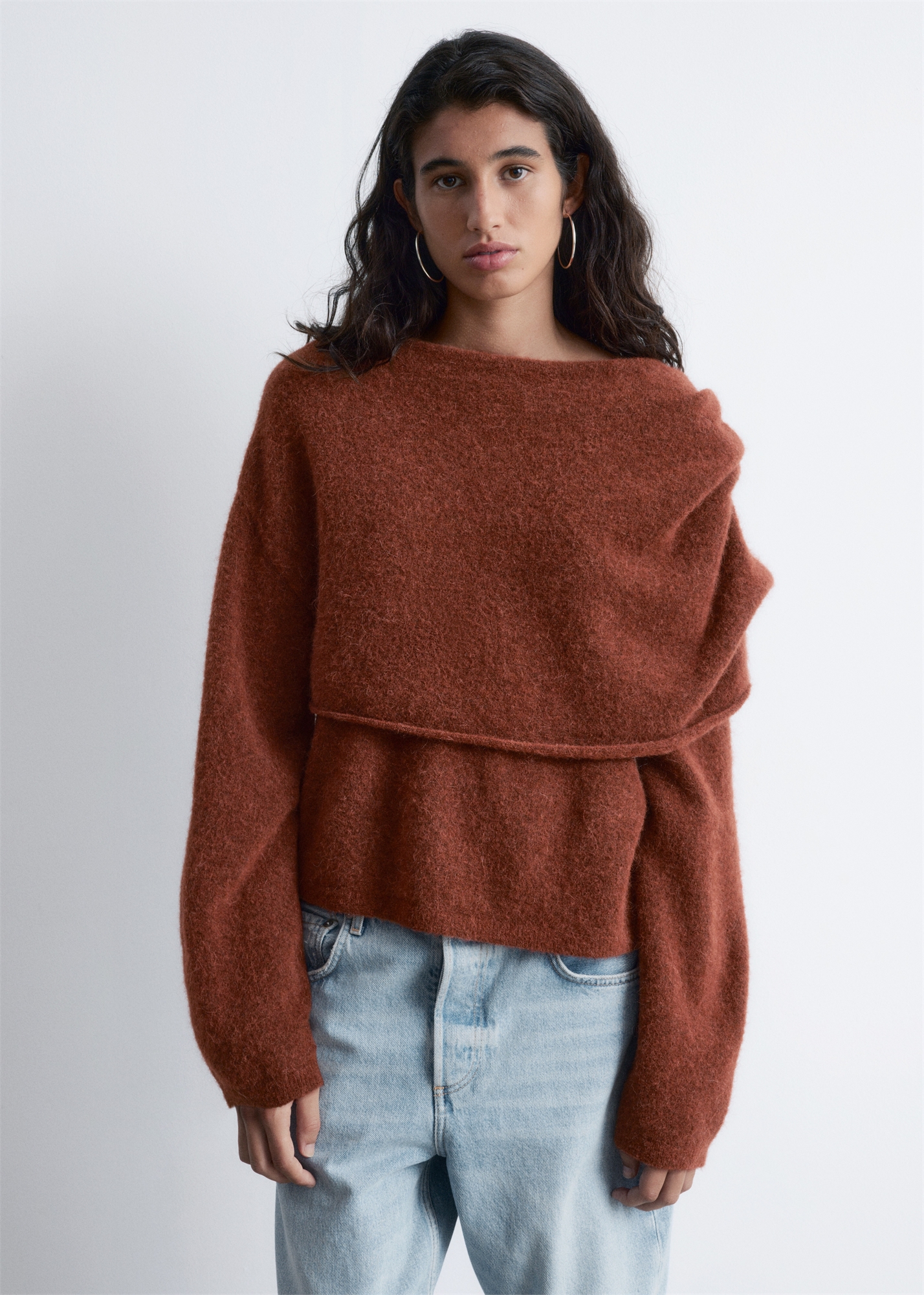 Этот свитер связан из смеси альпака и шерсти. Он имеет свободный силуэт, длинные рукава в форме кокона и вырез-лодочку со встроенной накидкой, которая складывается через плечо. 40% RAS Alpaca TE-00047206 32% RWS Wool TE-00047206 Длина свитера: 57 см / 22,4" (размер S)