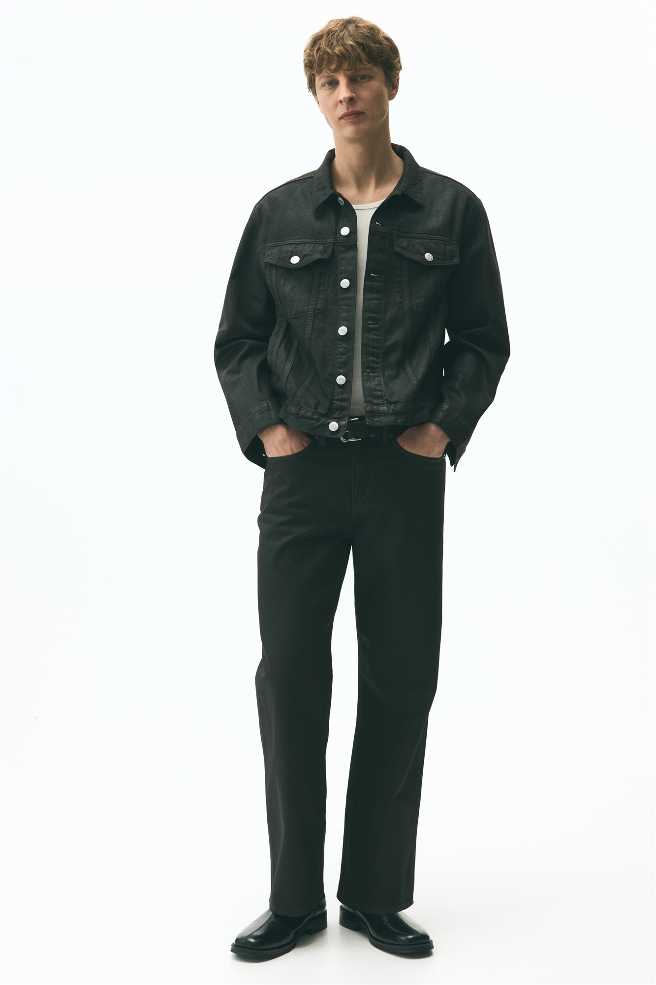Куртка из хлопкового денима с покрытием, воротником, металлическими пуговицами спереди, передом и спиной, накладными нагрудными карманами на пуговице и втачными боковыми карманами. Длинные рукава, манжеты на пуговицах и регулируемая застежка на пуговицах по бокам подола. Свободный крой для пышного, но не чрезмерно большого силуэта.