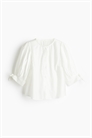 Блузка из тканого материала с круглым вырезом и пуговицами спереди. Рукава длиной до локтя со складками на плечах и завязывающейся деталью на манжетах.