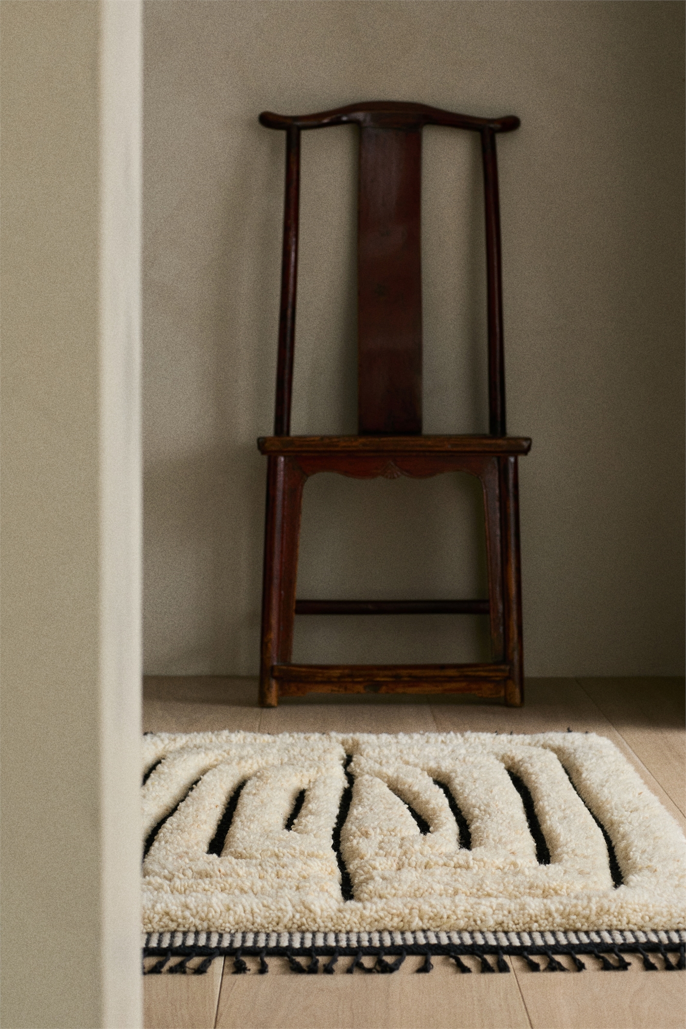 Ковер из шерстяной смеси с мохнатым ворсом, изготовленный из крученой пряжи с едва заметными переливами цвета. Имеет асимметричный узор в акцентном цвете и узорчатую отделку с бахромой по коротким сторонам. Поскольку каждый ковер соткан вручную, незначительные различия во внешнем виде делают каждое изделие уникальным. Обратите внимание, что новые ковры иногда имеют слабый запах, который легко устраняется проветриванием и чисткой пылесосом.
