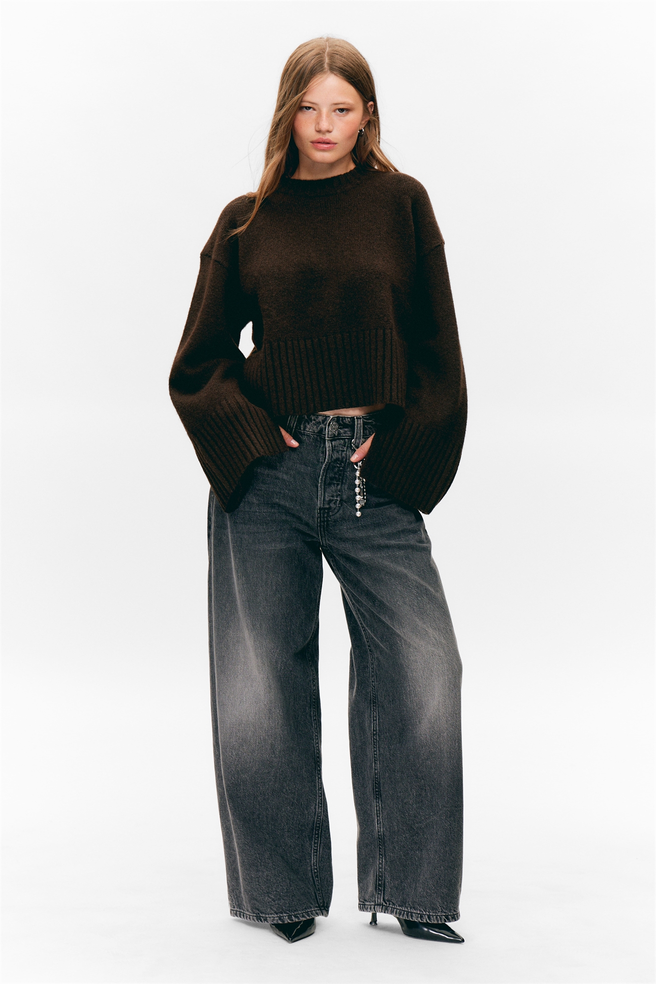 Свитер оверсайз с горловиной, ребристыми краями и разрезами на руках. Изготовлен из переработанного полиэстера и шерсти.