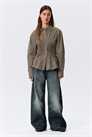 Рубашка с длинными рукавами, обычным кроем и фигурной талией. Изготовленная из хрустящего хлопкового поплина, она имеет заостренный воротник, швы с вытачками и сборку на талии для приталенного силуэта. Застежка на пуговицах, широкие манжеты и аккуратный подол.