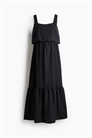 Платье для кормящих длиной до щиколоток из тканого материала с квадратным вырезом, широкими бретелями и широкими завязками сзади. Расклешенная юбка со сборчатым швом над коленями придает дополнительный объем. Конструкция включает в себя двойной слой в верхней части, чтобы помочь сохранить тепло и облегчить доступ к груди.