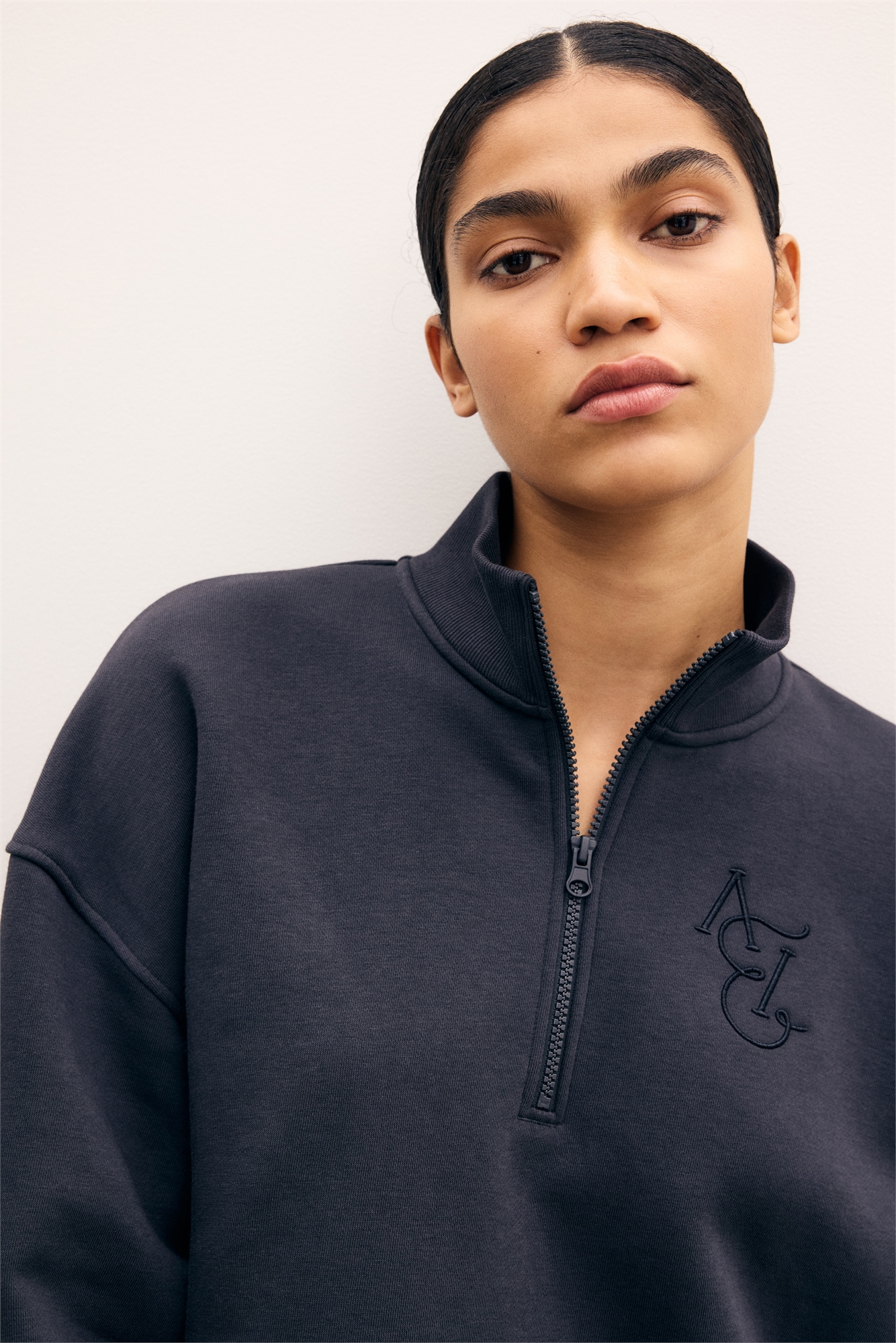 Спортивный топ с длинными рукавами, ребристым воротником-стойкой и застежкой-молнией в верхней части. Спущенные плечи и ребристые манжеты.