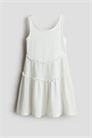 Платье без рукавов из мягкого хлопкового джерси с круглым вырезом и узкой окантовкой по вырезу и проймам. Закругленный шов на талии и многоярусная юбка из фактурного джерси с оборками.