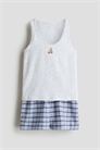 Пижама, состоящая из топа из джерси и пары шорт из мягкой ткани, сшита из хлопка. Топ без рукавов с круглым вырезом и небольшим принтом спереди. Шорты с эластичной талией.