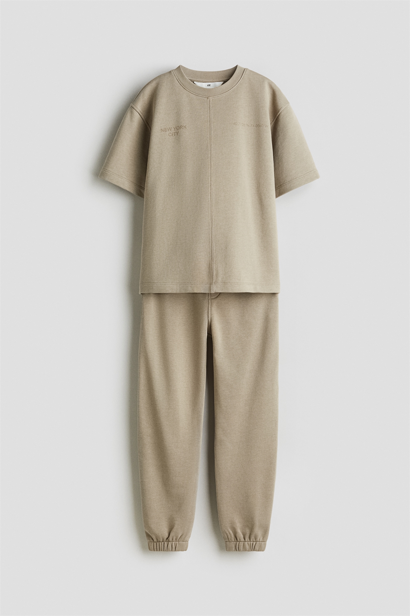 Комплект из футболки и джоггеров из легкого футера. Футболка с круглым вырезом, спущенными плечами и мелким принтом. Джоггеры с эластичным поясом и завязкой на талии, фальшивой ширинкой, неброскими боковыми карманами и открытым задним карманом. Эластичная резинка на подоле.