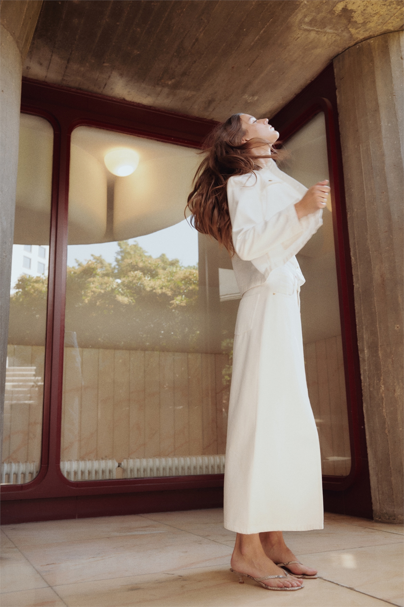 Юбка длиной до колена с 5 карманами из хлопкового денима с высокой талией и ширинкой на молнии с пуговицей. Подол прямого покроя с разрезом спереди.