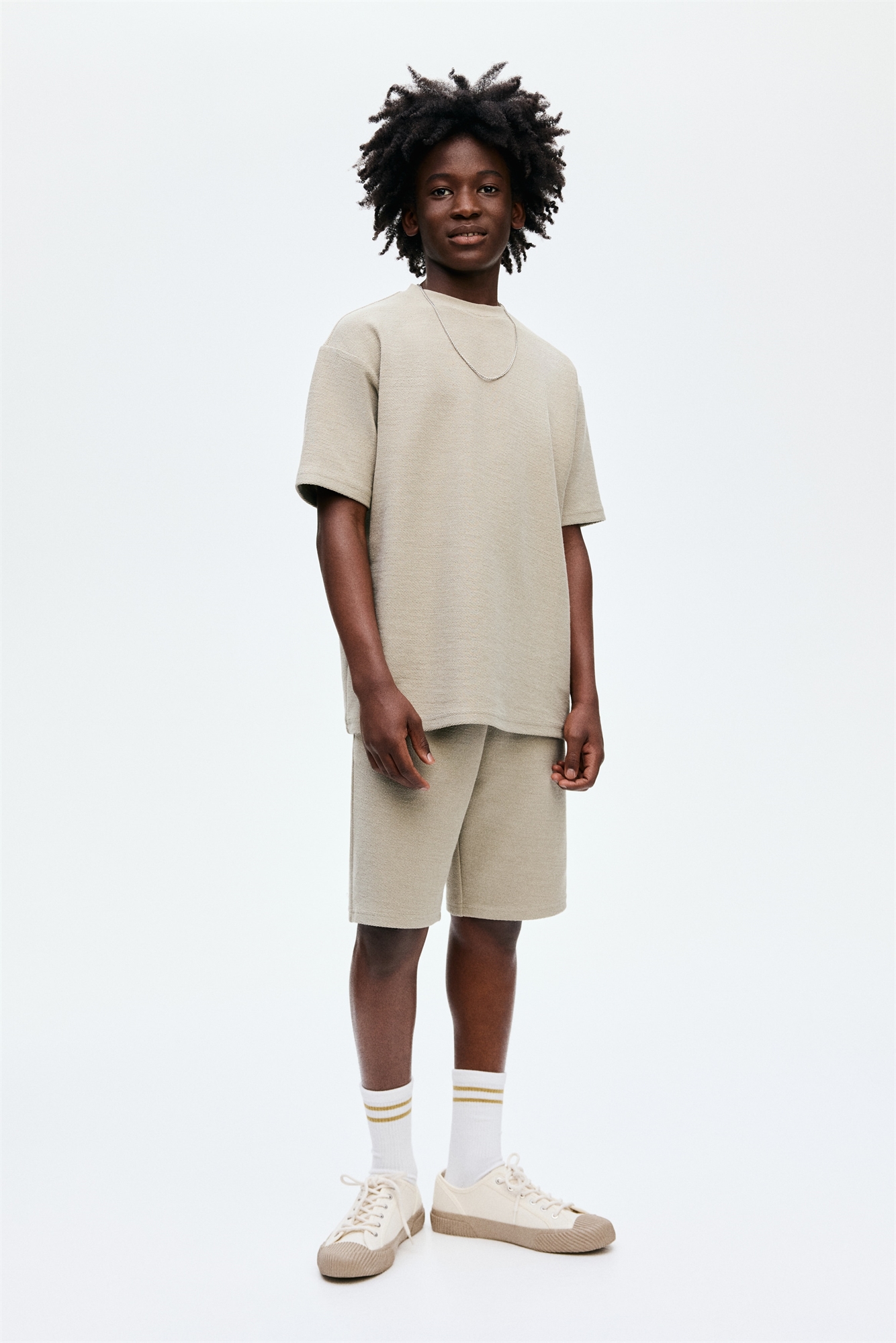 Комплект из футболки и шорт из легкой, фактурной ткани свитшот. Футболка с круглым вырезом и спущенными плечами. Шорты с эластичным утягивающим поясом и неброскими боковыми карманами.