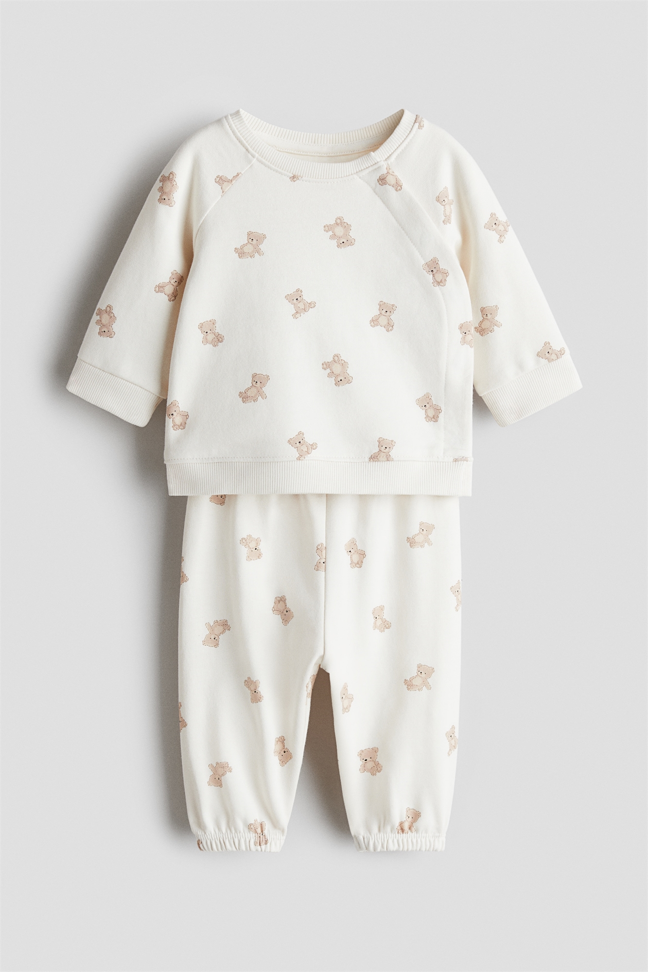 Комплект из топа и джоггеров из принтованного хлопкового свитшота. Топ с круглым вырезом и боковой проймой с застежкой на кнопки. Длинные рукава реглан и окантовка манжет и подола. Джоггеры с эластичной резинкой на талии и подол.