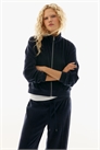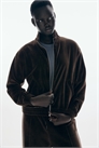 Короткая куртка свободного покроя из мягкого велюра с воротником-стойкой, застежкой-молнией спереди и диагональными карманами спереди. Эластичные манжеты и подол.
