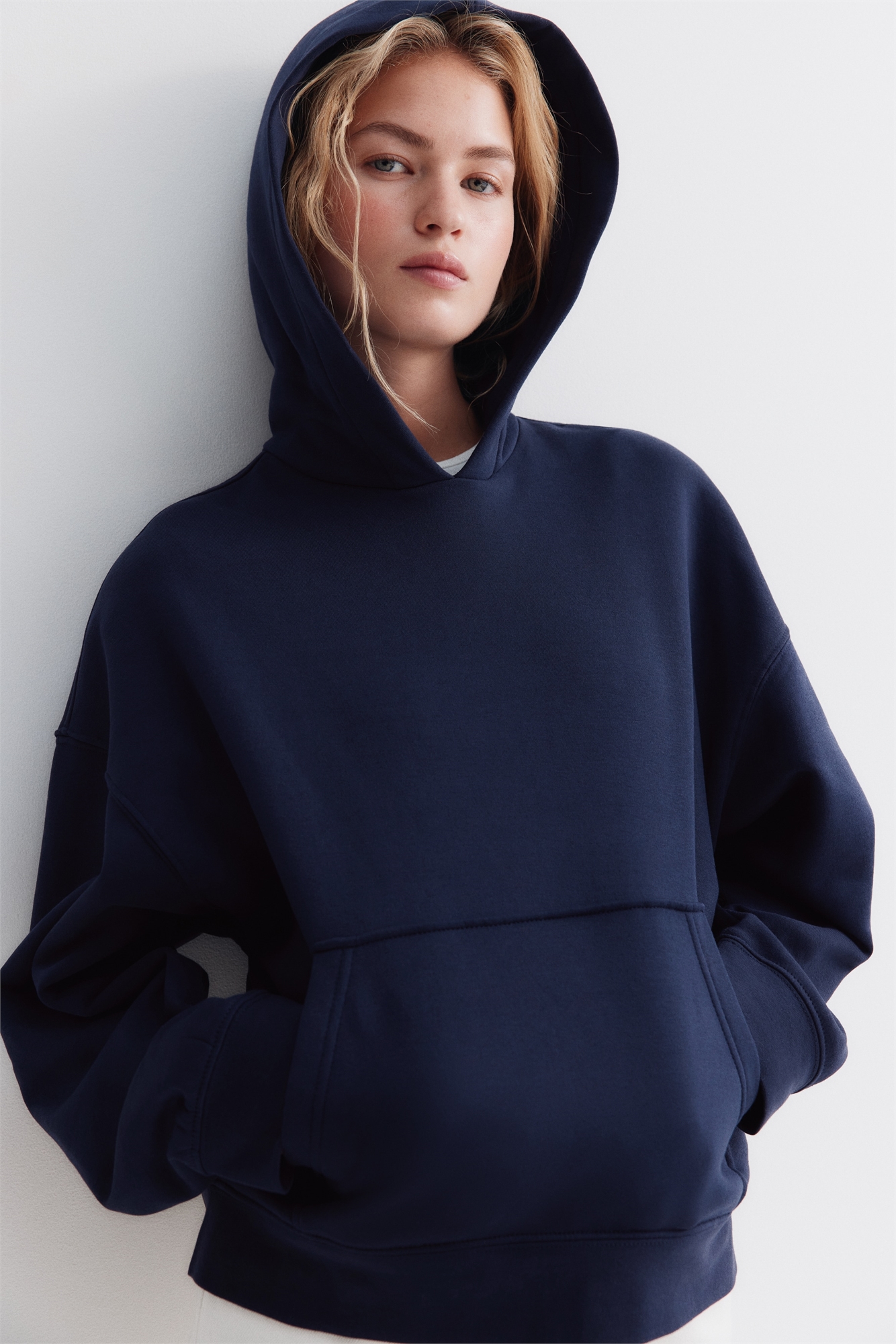 Топ большого размера из толстовочной ткани с мягкой начесом внутри. Двухслойный капюшон, карман-кенгуру, спущенные плечи и длинные рукава. Ребристые манжеты и подол.