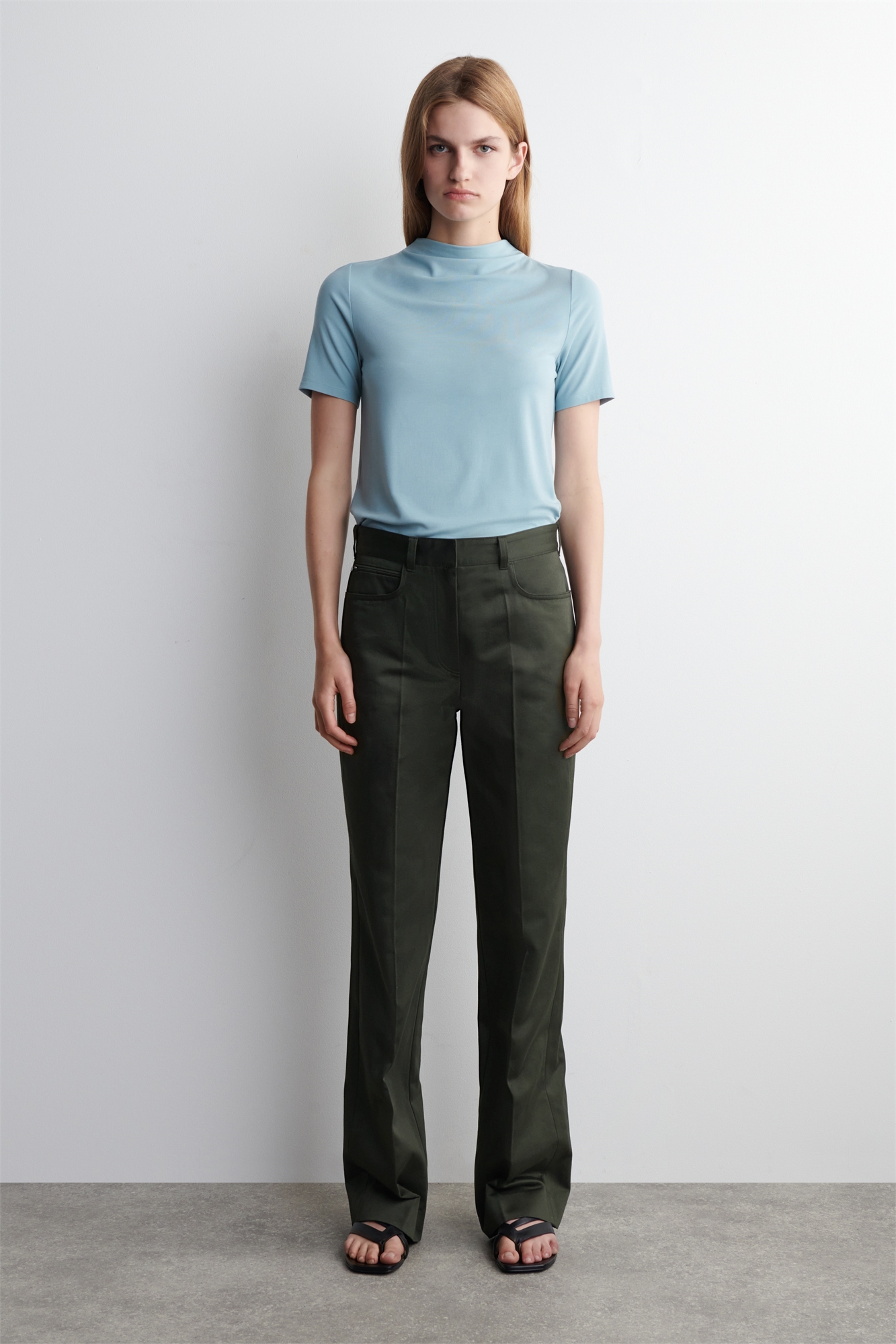 Команда женской одежды переосмысливает классический пошив благодаря первоклассным тканям и богатой тактильной обработке. Эти изысканные брюки сшиты из хлопка-сатина цвета земляного эспрессо, который подчеркивает тонкий блеск ткани. Они имеют прямой крой, среднюю посадку на талии и тонкий карман на молнии с одной стороны. Regular fitЗастежка на крючок, планку и молнию Оболочка и подкладка карманов: 100% хлопок. Без учета отделки / Машинная стирка Внутренняя длина штанины размера EU 36 составляет 81,4 см / Модель носит размер EU 36