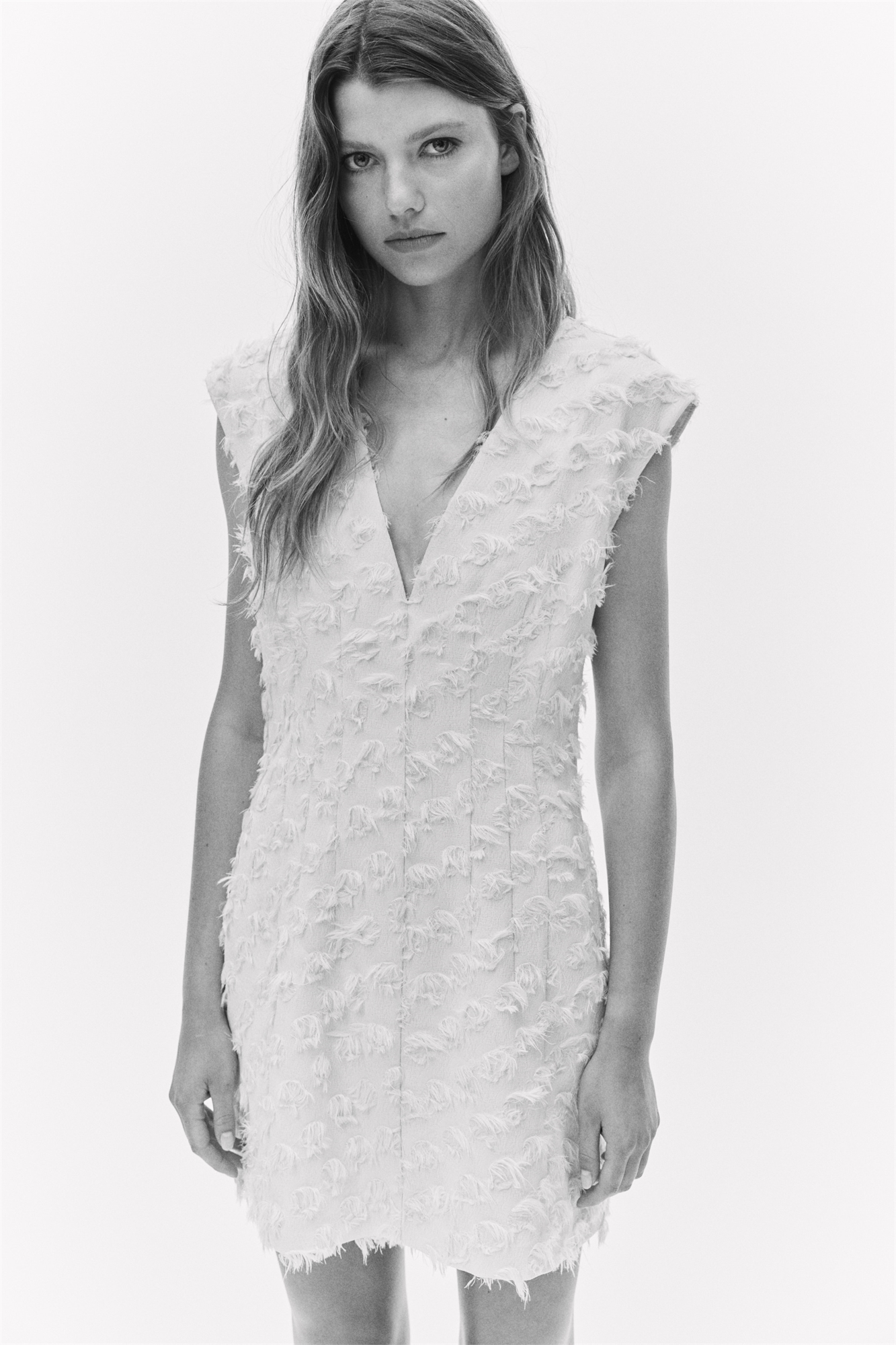 Короткое платье без рукавов из потертого жаккардового переплетения с глубоким V-образным вырезом и зауженной талией с формирующими швами спереди и сзади. Потайная застежка-молния с одной стороны. На подкладке.