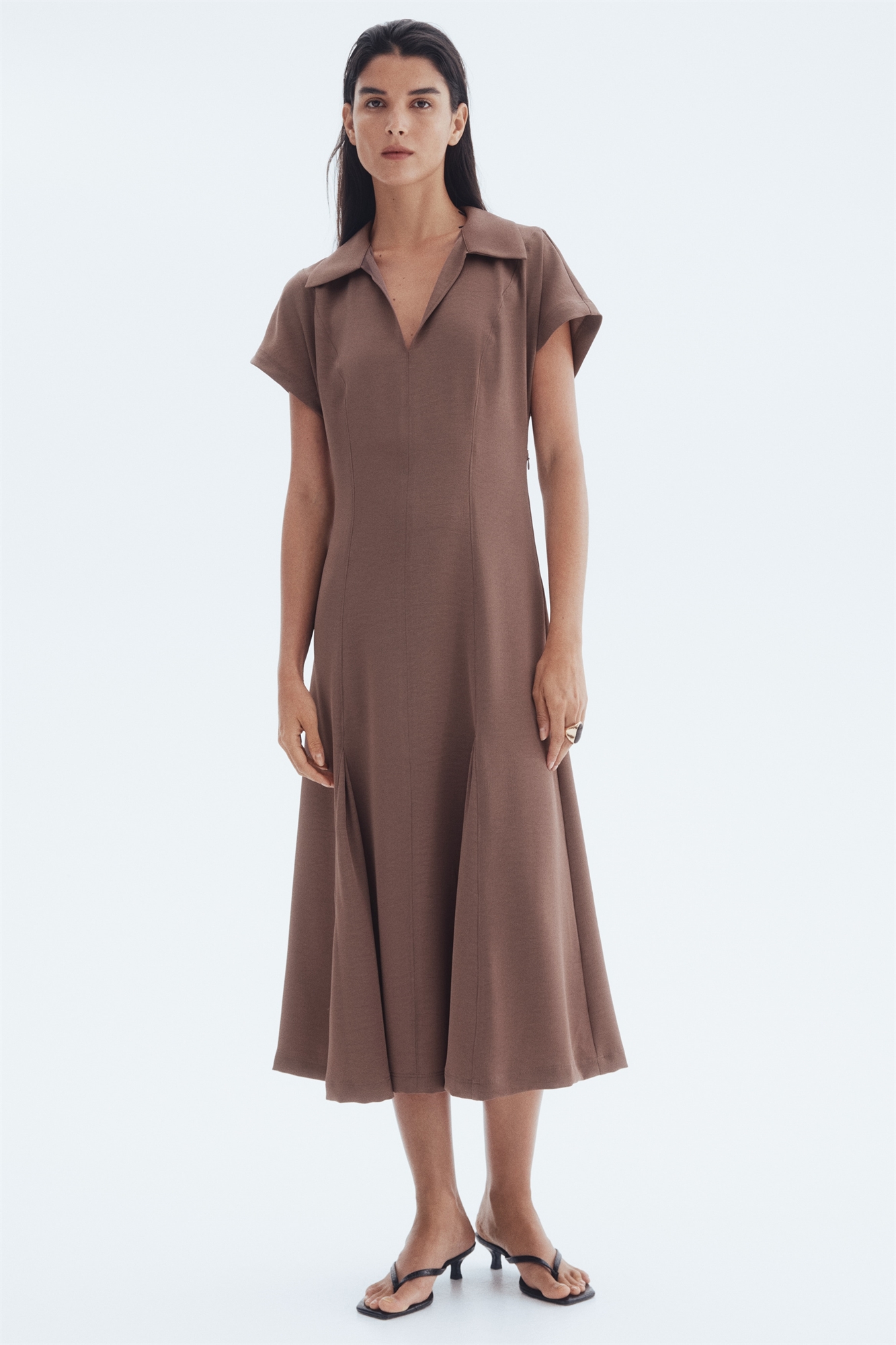 Платье длиной до колен из тканого материала с зауженной талией, подчеркивающей силуэт. Отложной воротник, короткие рукава и потайная застежка-молния с одной стороны. Швы "принцесса" спереди и сзади, а также складки godet на подоле спереди для придания дополнительного объема. Без подкладки.
