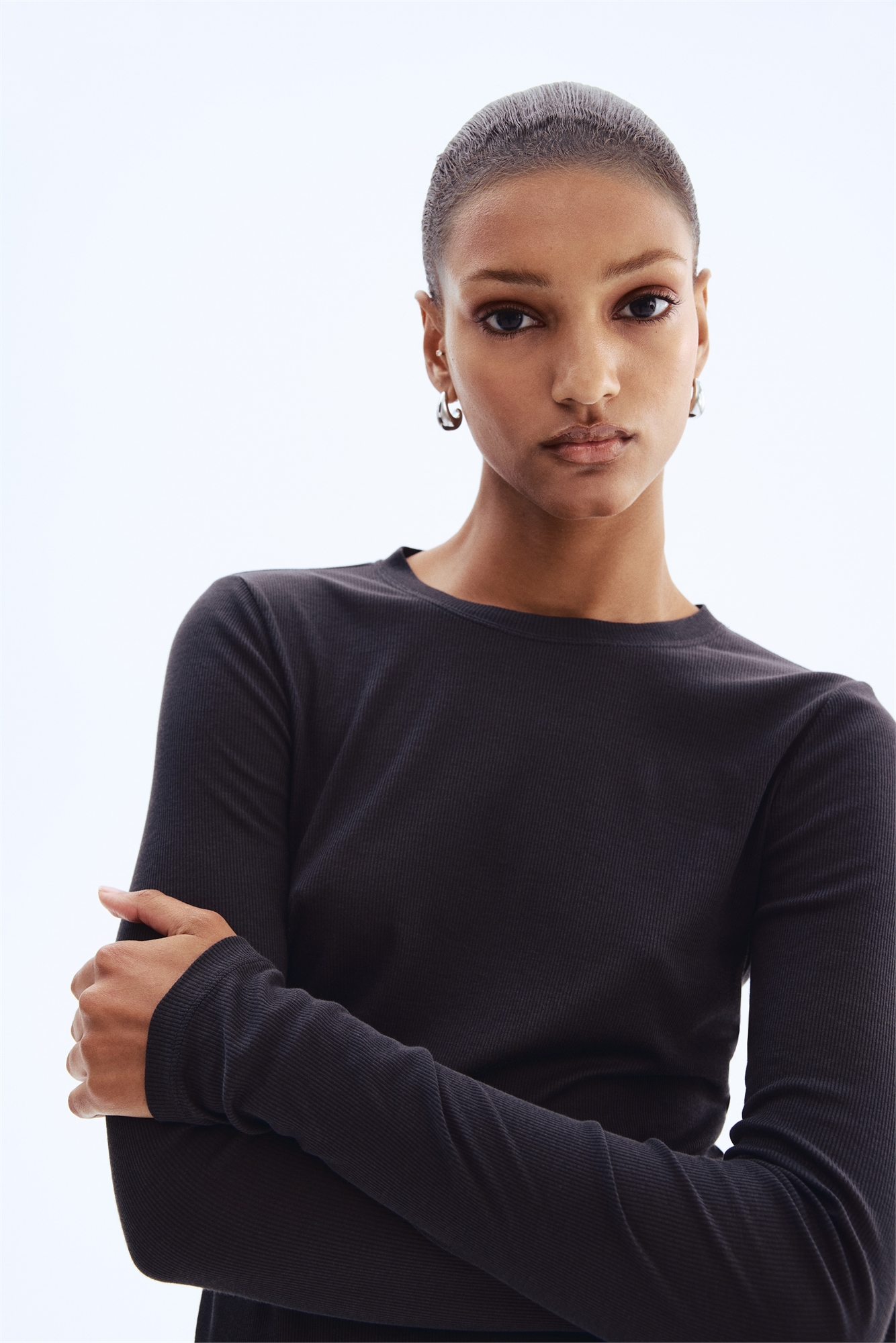 Облегающий топ из мягкого, ребристого хлопкового джерси пима. Круглый вырез с ребристой отделкой и удлиненные рукава.