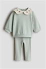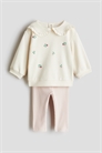 Комплект из топа из легкой толстовки с мягкой начесом внутри и леггинсов из мягкого ребристого трикотажа. Верхняя часть с закругленным воротником с оборками и проймой с кнопками на спине. Спущенные плечи, длинные рукава, манжеты и подол в рубчик. Леггинсы с регулируемой резинкой на талии.