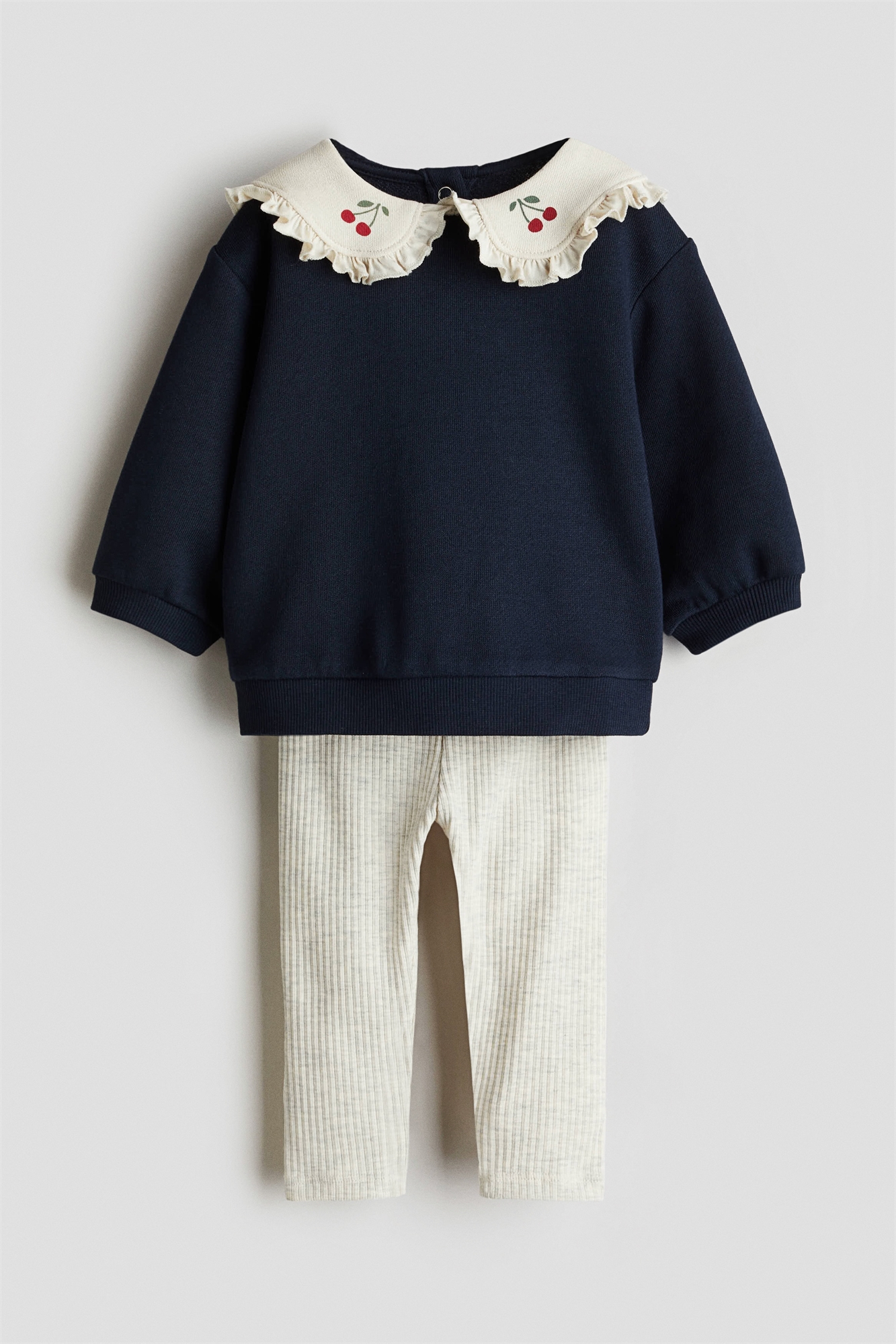 Комплект из топа из легкой толстовки с мягкой начесом внутри и леггинсов из мягкого ребристого трикотажа. Верхняя часть с закругленным воротником с оборками и проймой с кнопками на спине. Спущенные плечи, длинные рукава, манжеты и подол в рубчик. Леггинсы с регулируемой резинкой на талии.