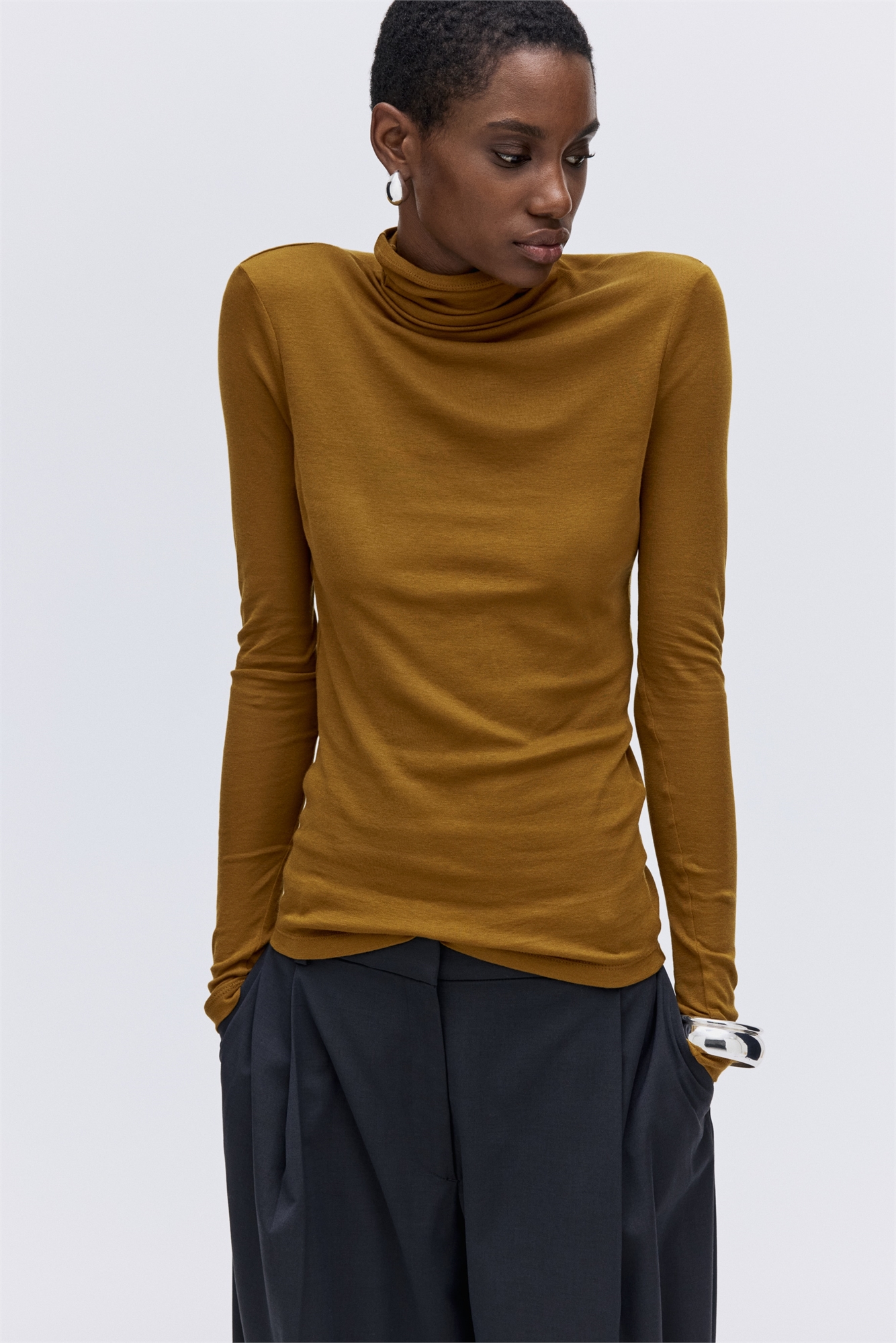 Топ из мягкого хлопкового джерси пима с черепаховой горловиной и удлиненными рукавами.