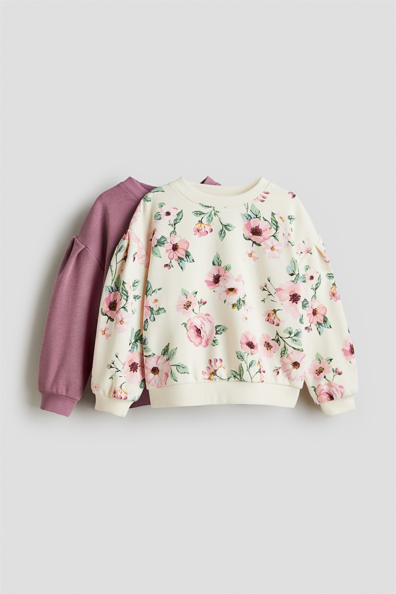 Топы из принтованной толстовки с мягкой ворсистой внутренней стороной. Круглый вырез с ребристой отделкой, спущенные плечи и длинные пышные рукава. Ребристые манжеты и подол.