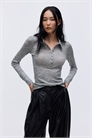 Рубашка-поло из ребристого шерстяного трикотажа с воротником, пуговицами в верхней части и длинными рукавами.