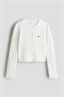 Кардиган мягкой вязки "косы" из вискозного бленда с небольшой вышитой деталью спереди. Круглый вырез с ребристой отделкой, пуговицы спереди, длинные рукава, манжеты и подол в рубчик.
