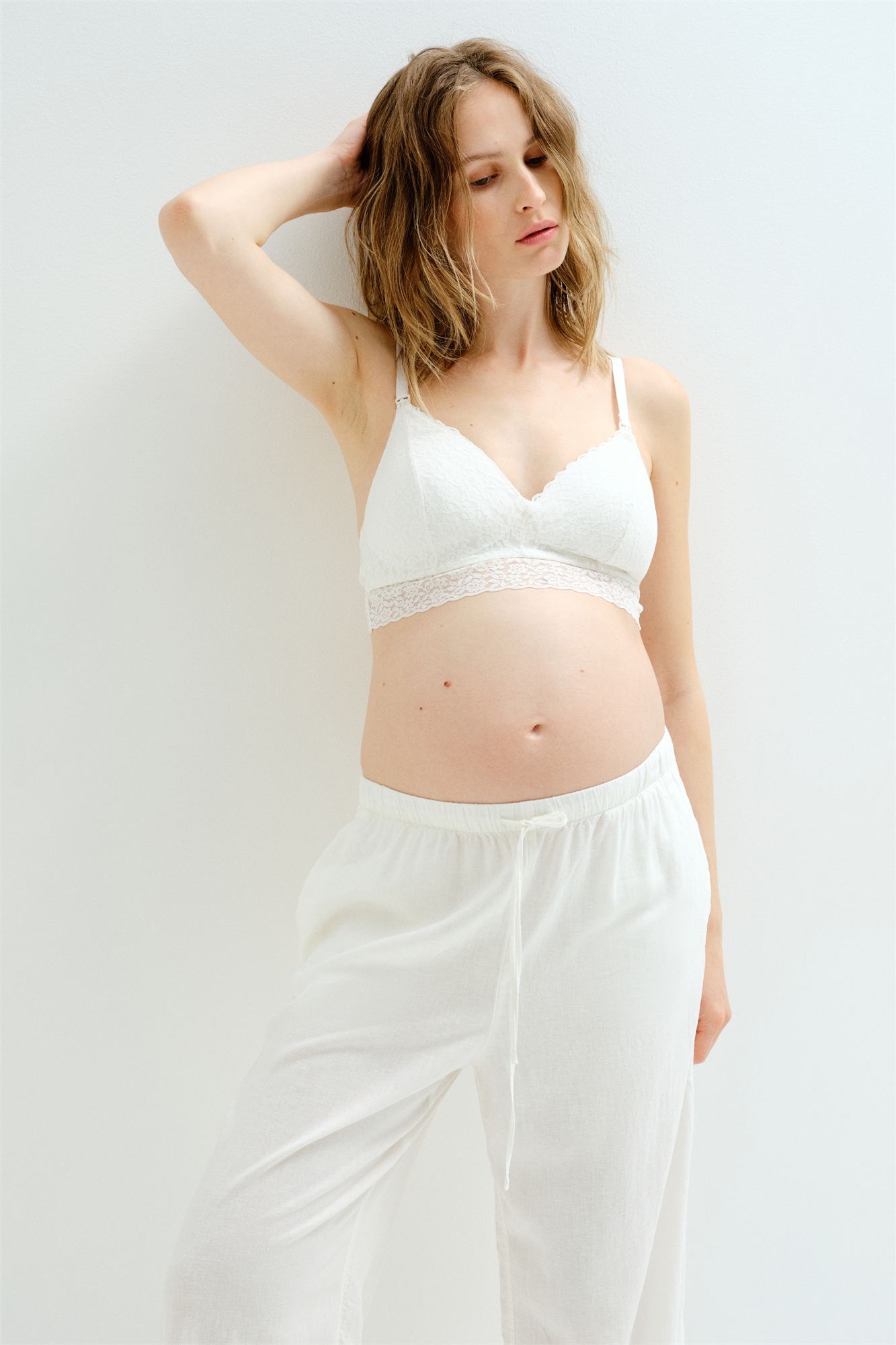 Мягкие кружевные бюстгальтеры для кормления без проводов с регулируемыми бретелями и мягкими открытыми чашечками с местами для вкладышей. Застежка на крючки и глазки сзади.