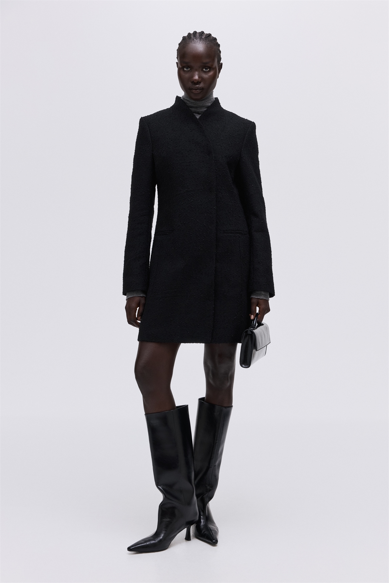 Короткое приталенное платье-блейзер из ткани букле с двубортной застежкой спереди и потайными кнопками. Воротник-стойка с V-образным вырезом, втачные карманы спереди, подплечники и длинные рукава. На подкладке.
